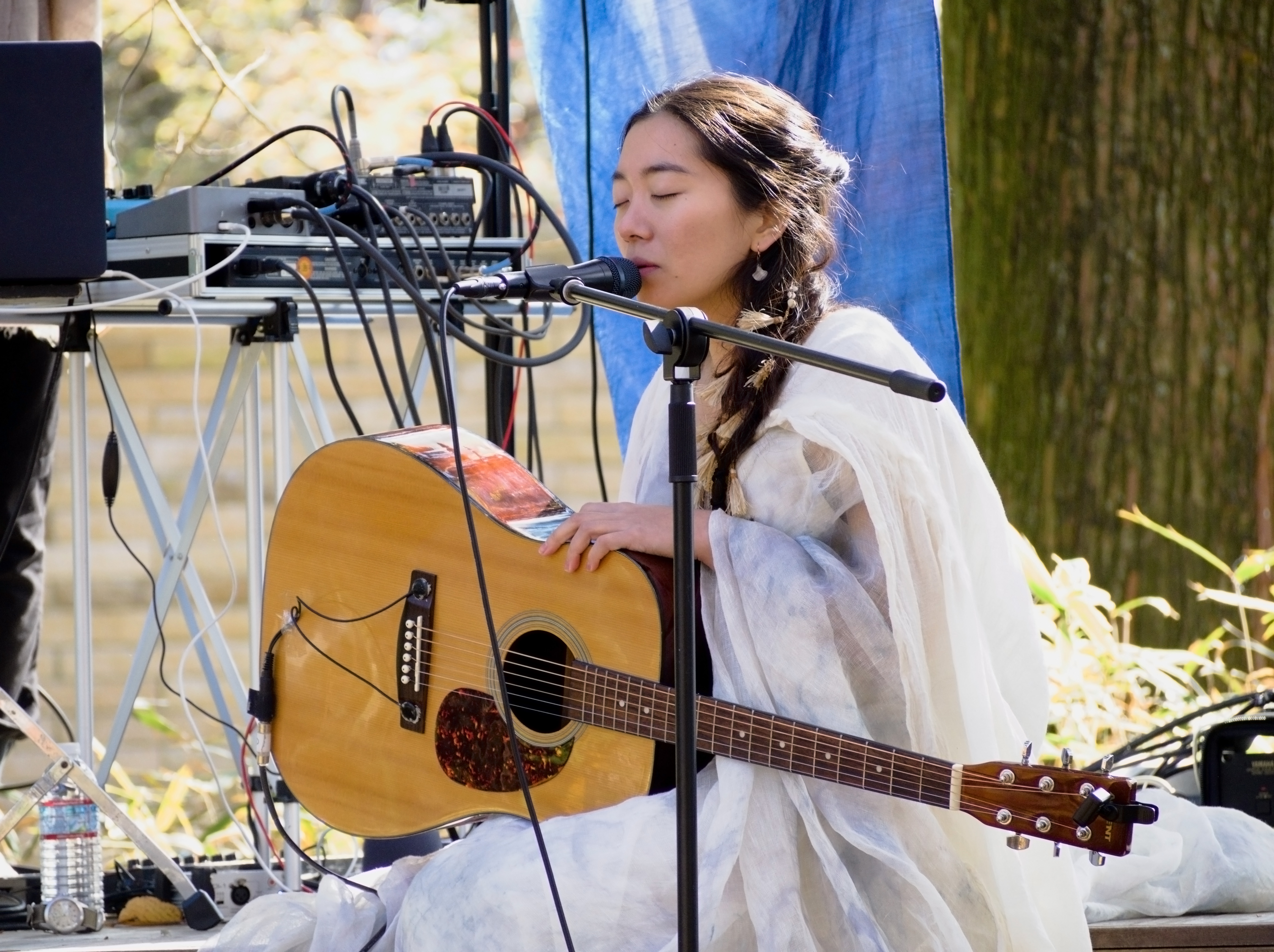 演奏する2人はKaorikoの衣、Bon Mooreの装飾をそれぞれ纏い、LIVEを行った屋外のスペースは染められた布で美しく彩られました。